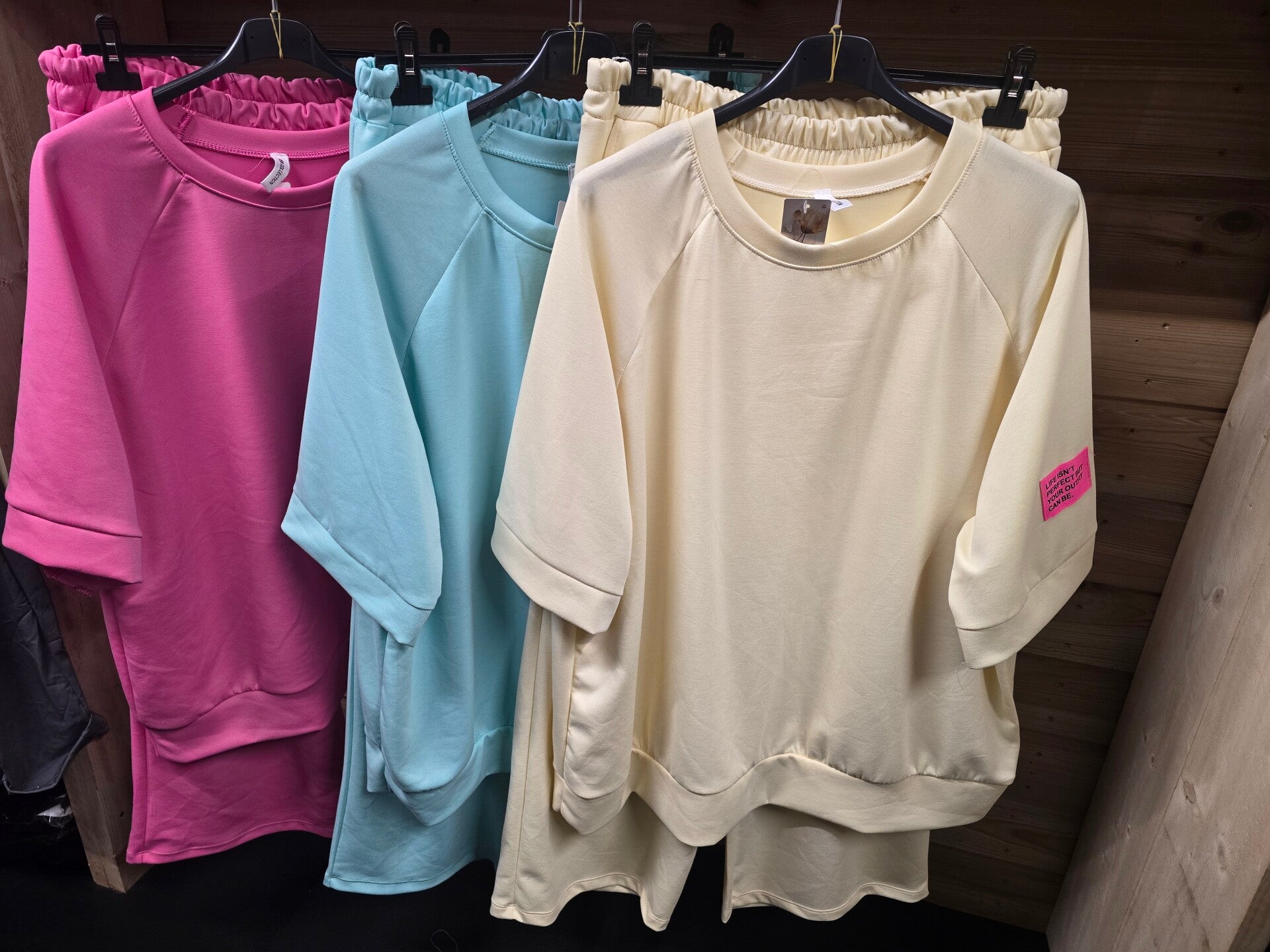 Tekstlogo op de broek en shirt life isn't perfect but your outfit can be.