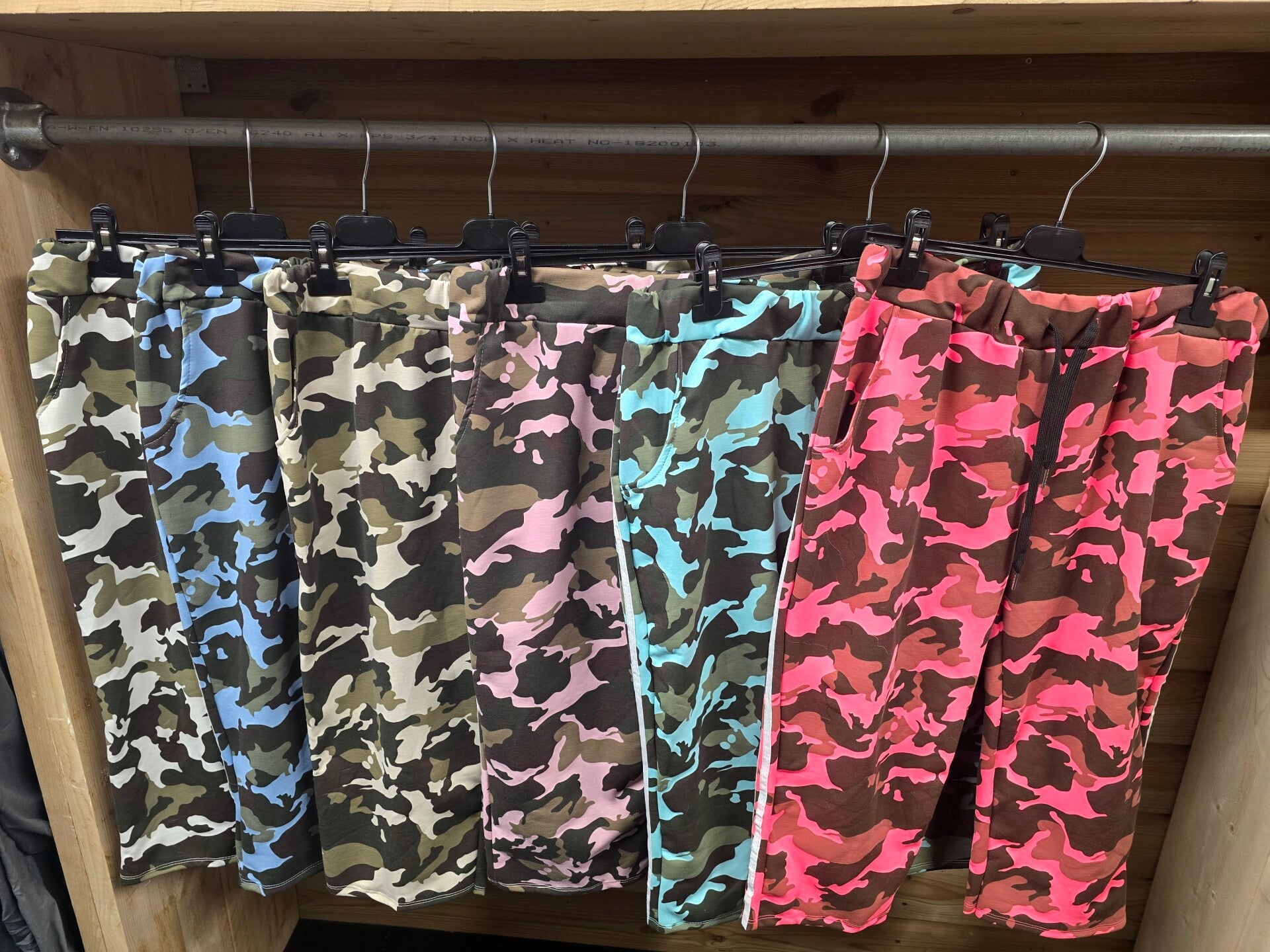mooie viscose rek driekwart broek met een gave army print erop. Adidas look A like strepen aan de zijkant..